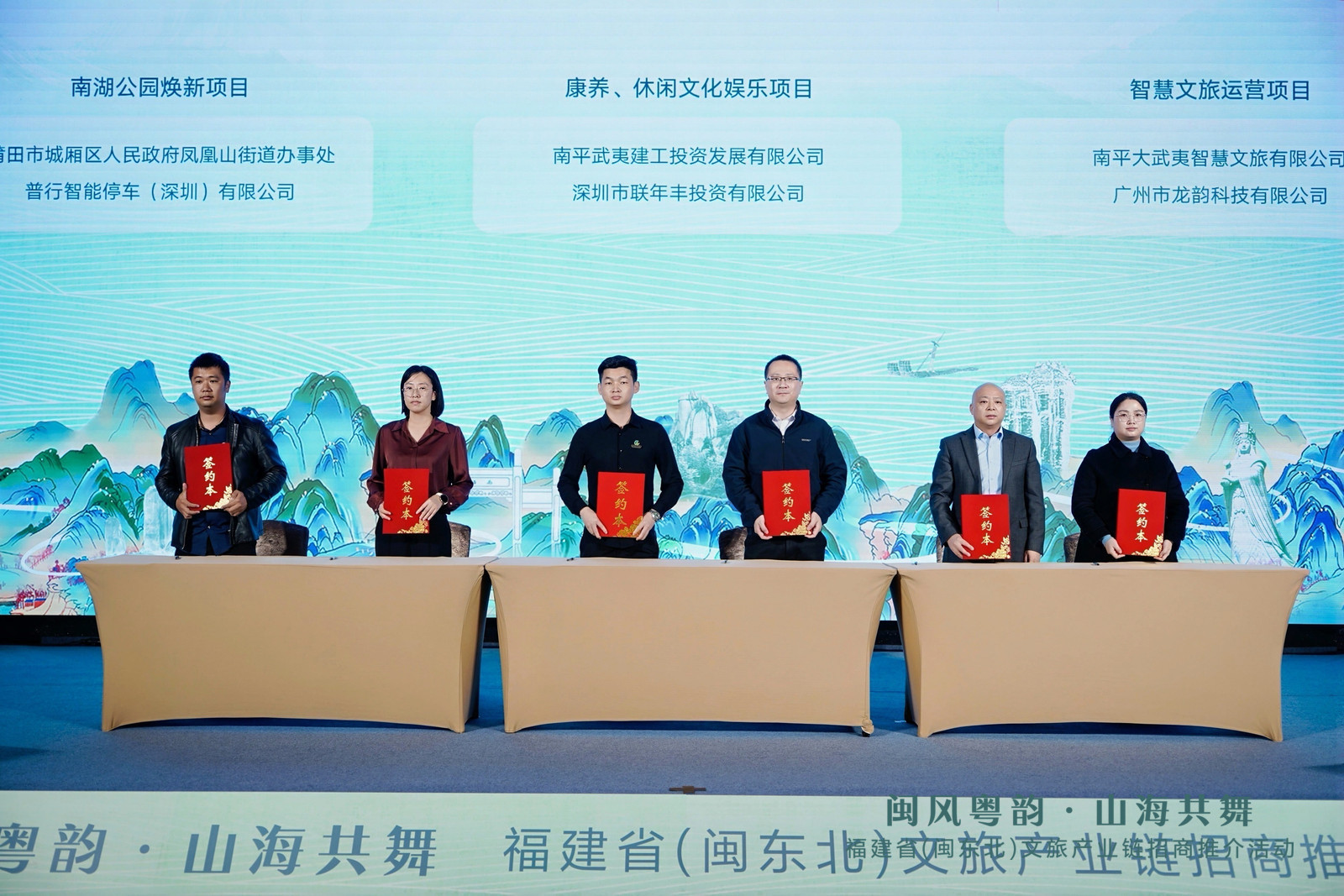经过前期精准对接,南平武夷文化旅游投资开发有限公司、南平市建阳区人民政府、莆田市城厢区人民政府等分别与广东东方旅文文化旅游集团有限公司、利亚德集团励丰文化、普行智能停车(深圳)有限公司等6家广东文旅企业签署战略合作协议,6个项目总投资7.1亿元。此次签约既是闽东北文旅资源与大湾区资本、技术、人才的双向奔赴,更是闽粤两地深化“地缘相近、人文相亲”情谊的生动实践。